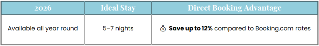 Send us your dates via WhatsApp and receive your best available direct offer — up to 12% lower compared to Booking.com rates.